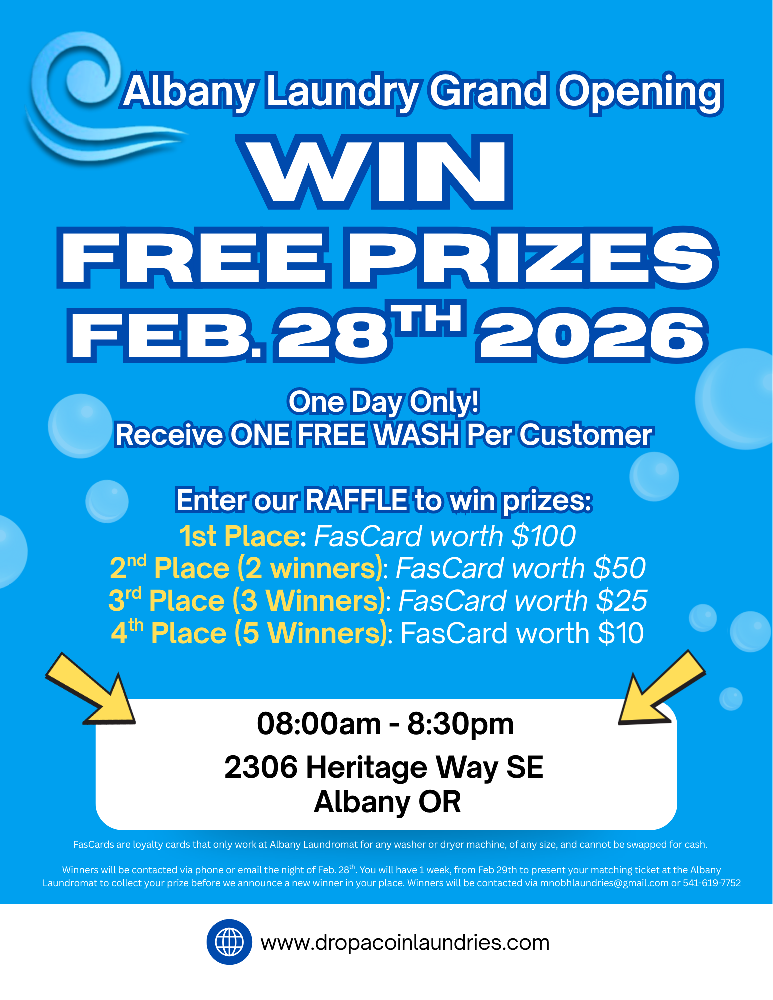 We’re excited to announce our newest Drop A Coin Laundries location at Heritage Mall (2306 Heritage Way SE). Enjoy self-service laundry with friendly staff, or try our convenient Wash & Fold service for Albany and nearby areas.